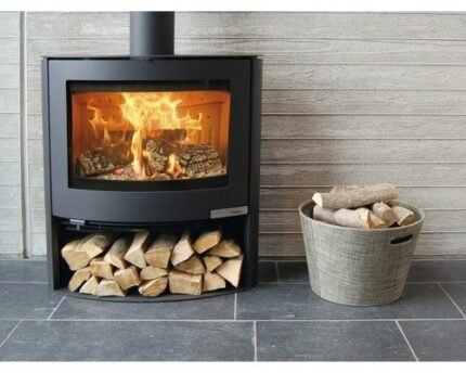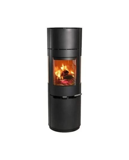Die dreiseitige Panorama-Verglasung ermöglicht einen beeindruckenden Blick auf das Feuer. Das innovative Türsystem mit Doppelfunktion – Guillotine-Schiebetür nach oben und seitliche Öffnung – erleichtert sowohl das Nachlegen von Holz als auch die Reinigung.