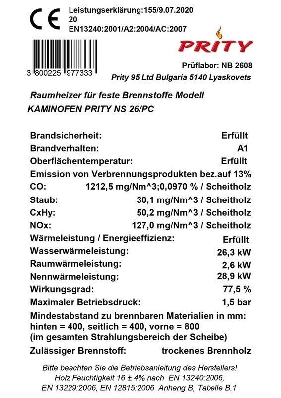 Der Prity NS26 ist ein leistungsstarker Holzvergaserofen mit integrierter Wassertasche, der effiziente Wärme und umweltfreundliche Technologie vereint. Mit einer Gesamtleistung von 28,9 kW (26,3 + 2,6 kW) eignet er sich ideal zur Beheizung großer Räume und ganzer Wohnbereiche.